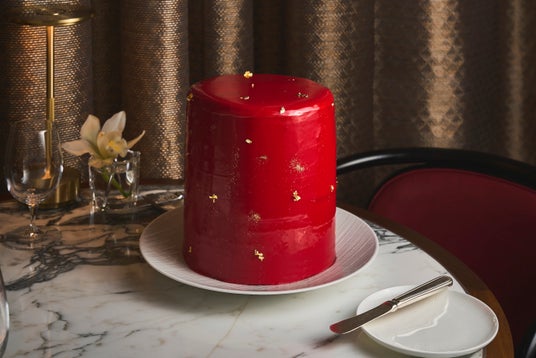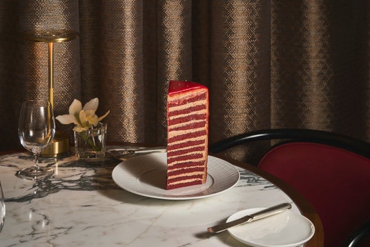 「REGINE」のキーカラーであるレッドを大胆にまとった、高さ約20cm・24層仕立てのベルベッドケーキ。果実のニュアンスと繊細な技を重ね、視覚と味覚の両面から印象に残る一皿として誕生しました。15周年という記念すべき年にふさわしい、ブラッスリーならではの美意識と遊び心を体現したデザートです。