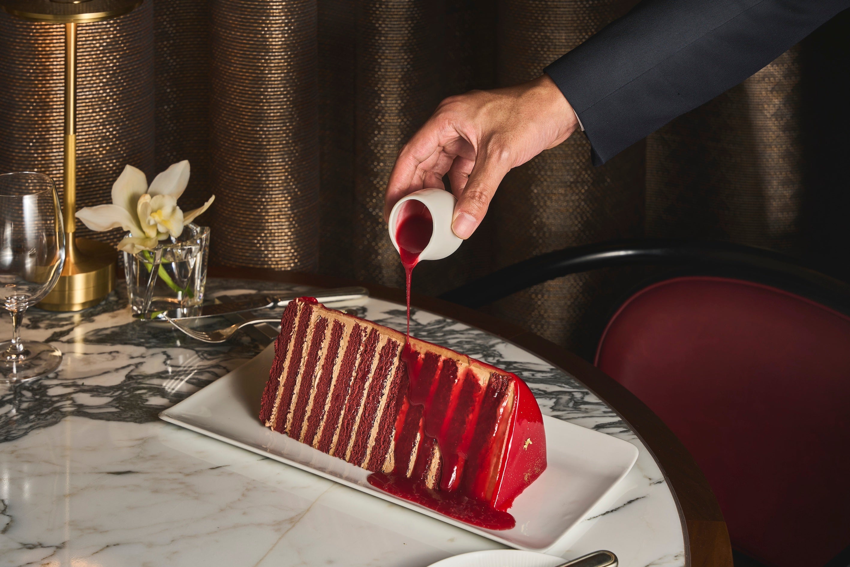 ブラッスリー「REGINE」店内にて、ティータイムにケーキセットとしてのご利用に加え、ランチやディナーの余韻を彩るデザートとしてもお召し上がりいただけます。日常から記念日まで、さまざまなシーンに寄り添う「タワー・オブ・アスター」。15周年を迎えたセント レジス ホテル 大阪の節目を象徴する一品として、色彩、美意識、そして余韻が静かに重なり合うひとときをお届けします。ブラッスリー「REGINE」ベルベッドケーキ「タワー・オブ・アスター」