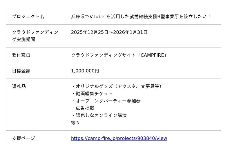 生きづらさを抱えている人のためにリアルとバーチャルの架け橋になるための活動をするNPO法人ReverV(住所地:兵庫県西宮市、代表:中島大樹)では2026年3月にVTuberスタッフが支援する就労支援事業所を兵庫県西宮市に開設するためのクラウドファンディングをCAMPFIREで12月25日より開始します。