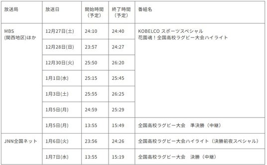この度、第105回全国高等学校ラグビーフットボール大会(以下、全国高校ラグビー大会)のテレビ放映において、今年度もコベルコ神戸スティーラーズのチームCMを放映することとなりましたので、お知らせいたします。第102回大会より4年連続での放映となります。