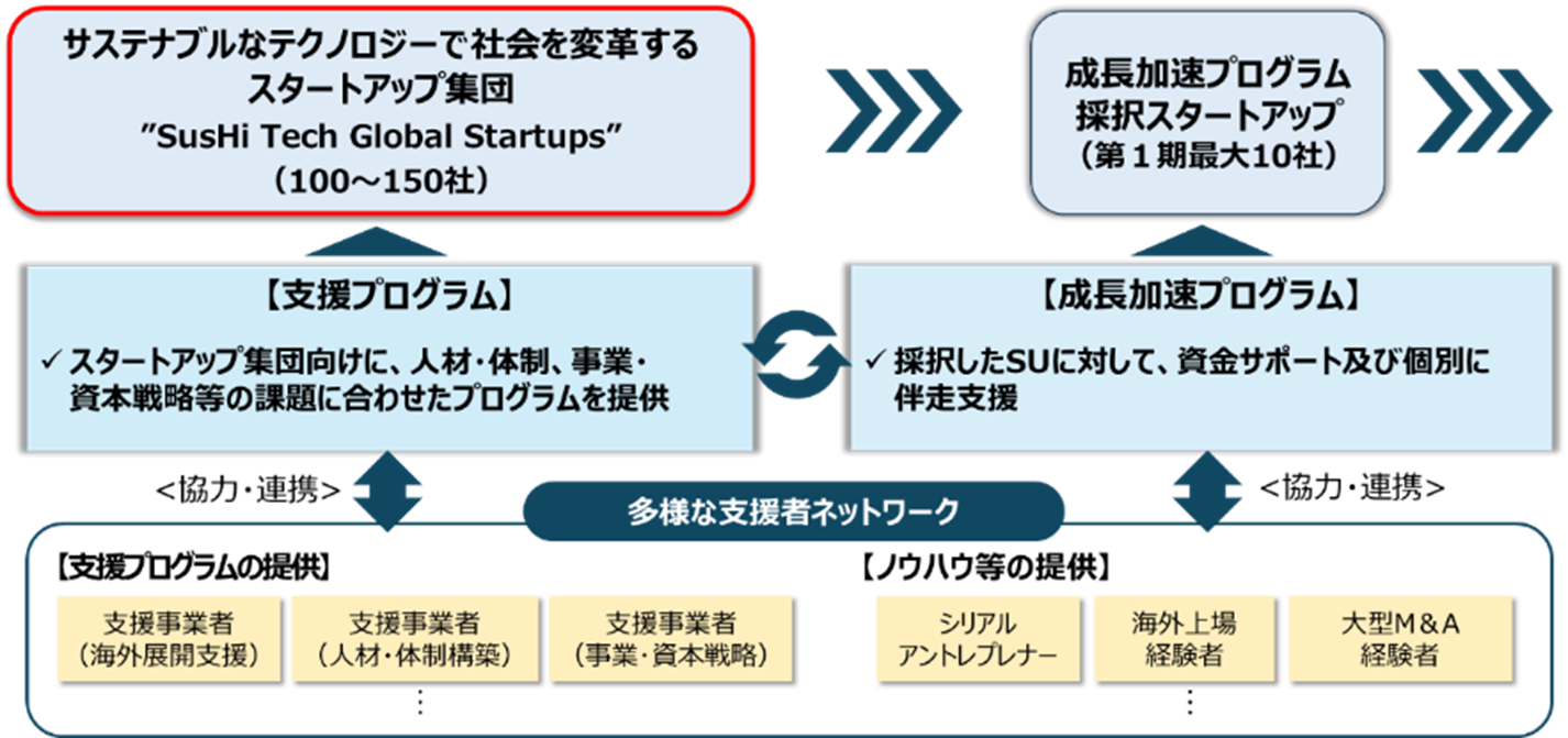 - さらに、“SusHi Tech Global Startups”の中から、グローバルな成長につながる取組を募り、「成長加速プログラム」として1件当たり上限2億円の資金サポートとオーダーメイド型の伴走支援を実施します。