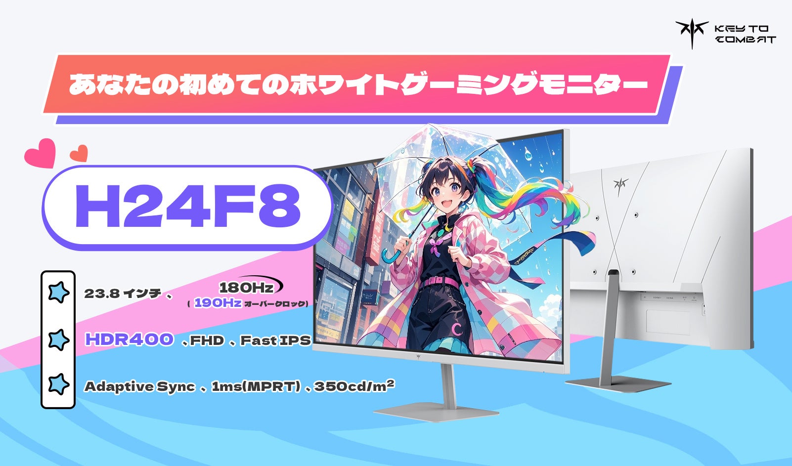 最後は、限られたスペースと予算の中で、最大限のパフォーマンスを引き出したい方へ。23.8インチコンパクトモニター「H24F8」は、180Hz(OC 190Hz)の高リフレッシュレート と 1msの応答速度 というeスポーツの基本性能を、驚くべき価格で実現します。フレームレスデザインがマルチモニター配置を容易にし、戦略的なデスク環境を構築する強力な基盤となります。