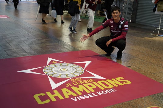 神戸・三宮センター街1丁目をさらに進んでいくと、クラブ創設29年目の2023年シーズンに悲願のJ1初優勝した際に制作され、様々なグッズにも使用されたチャンピオンロゴが全長約2.4mの床面展示になって登場。