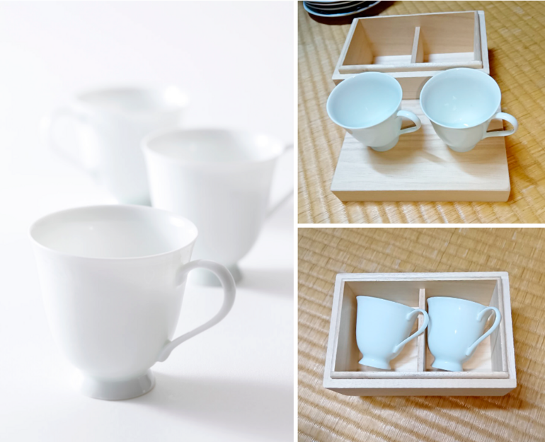 佐世保市三川内の歴史あるやきもの、三川内焼が届くプラン。薄手白磁成形焼成技術で長崎県無形文化財保持者に指定された中里末太郎による、薄さ1.5mmの繊細なカップです。