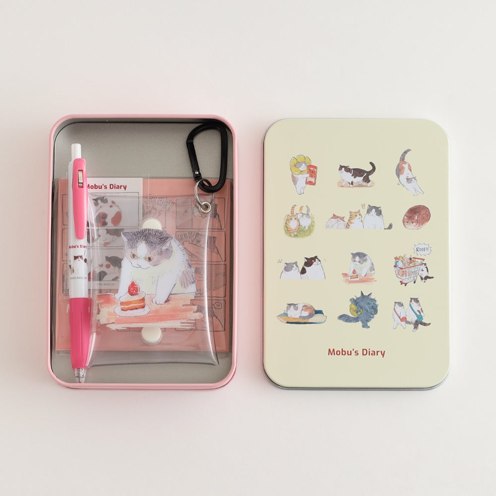 ギフト缶セット。ボールペン、PVCマルチケース、ステッカー、裏紙メモが入っています。