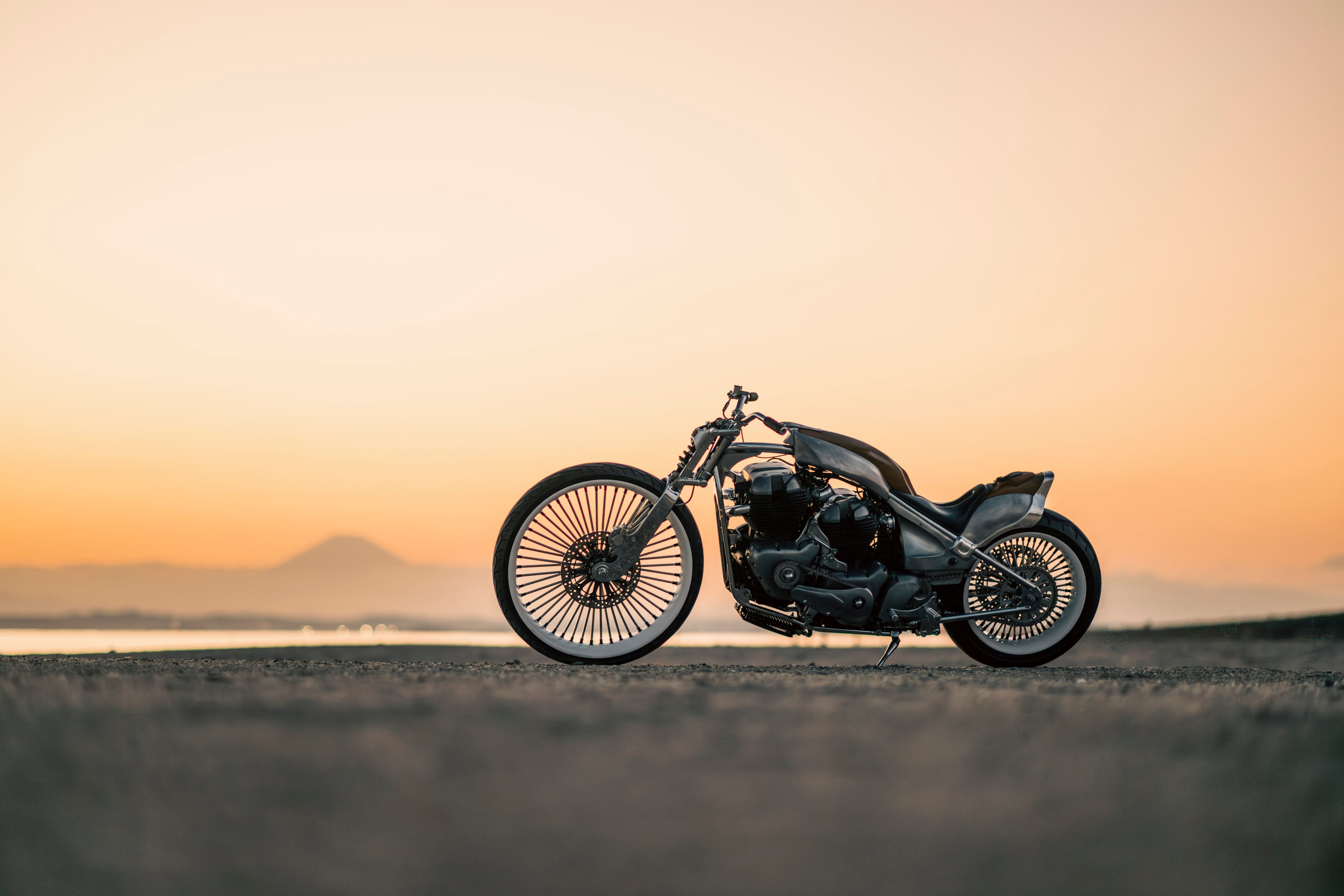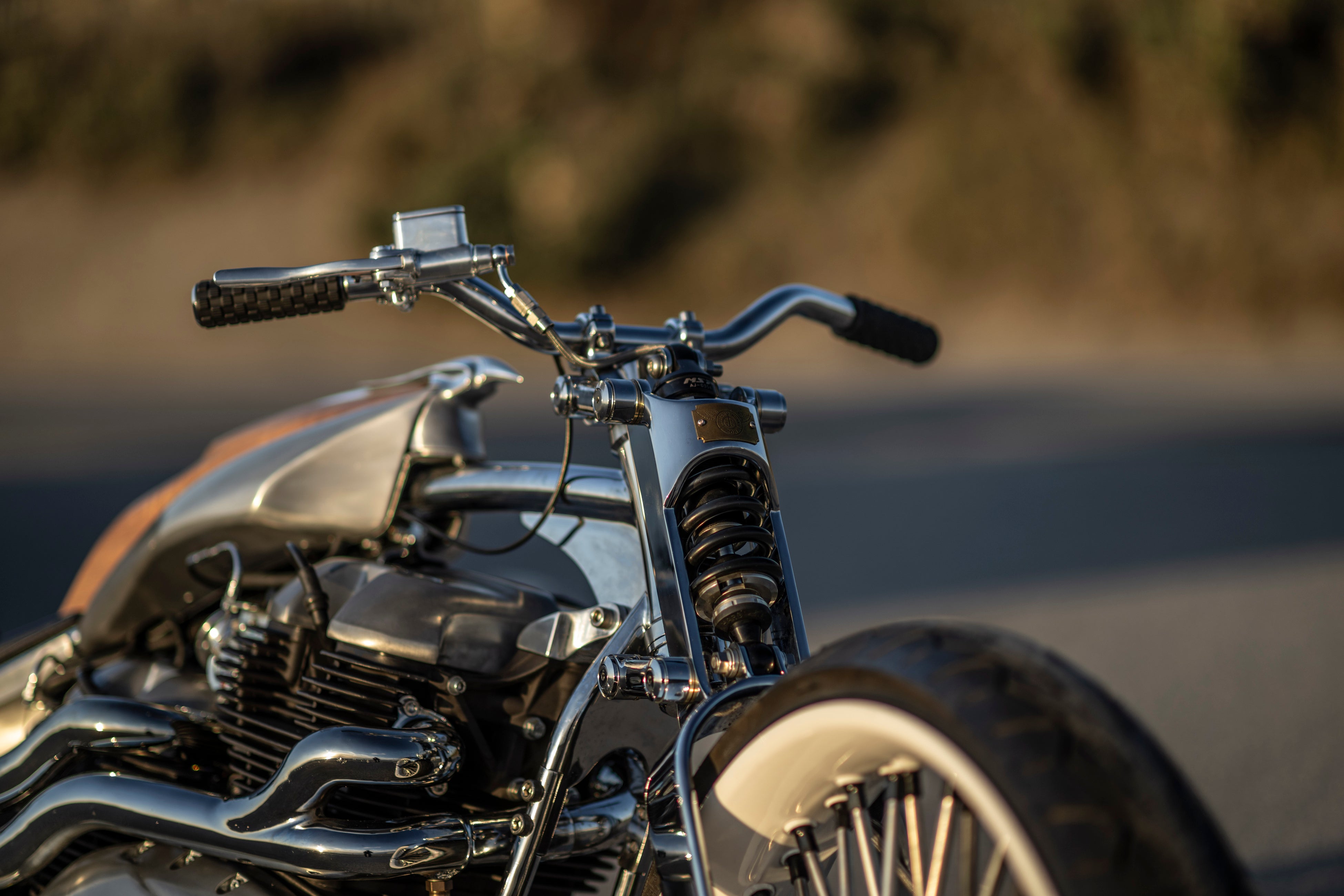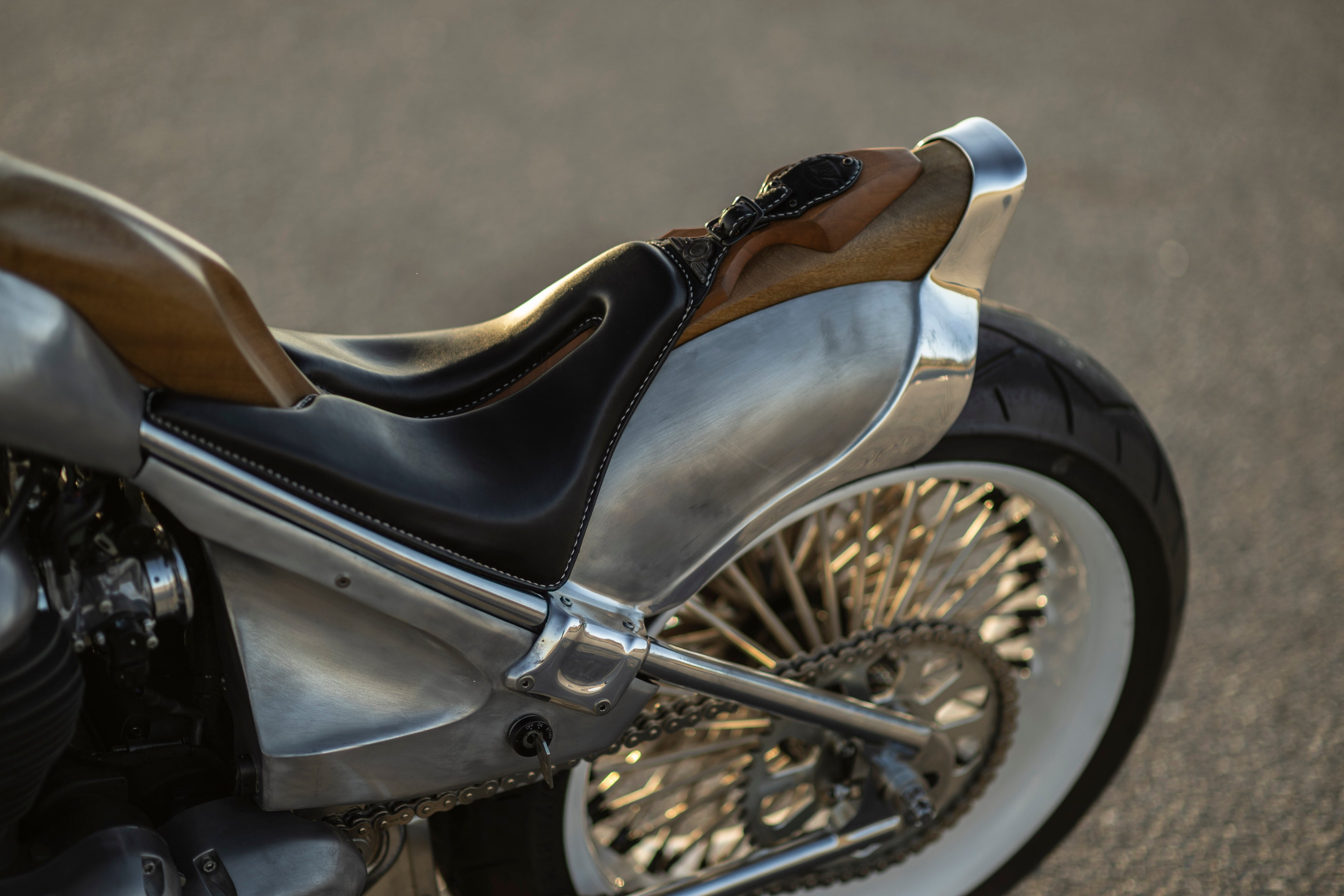 そのエンジンはゼロから製作したオリジナルフレームに搭載しました。独自に設計したクラシカルなガーダーフォークに、26インチというモダンな大径ホイールをセット。モダンとクラシックの融合を果たしています。外装にはマホガニー材を使用。それとリンクする外装類は塗装を廃し、アルミの地肌と木目が美しくリンクしています。