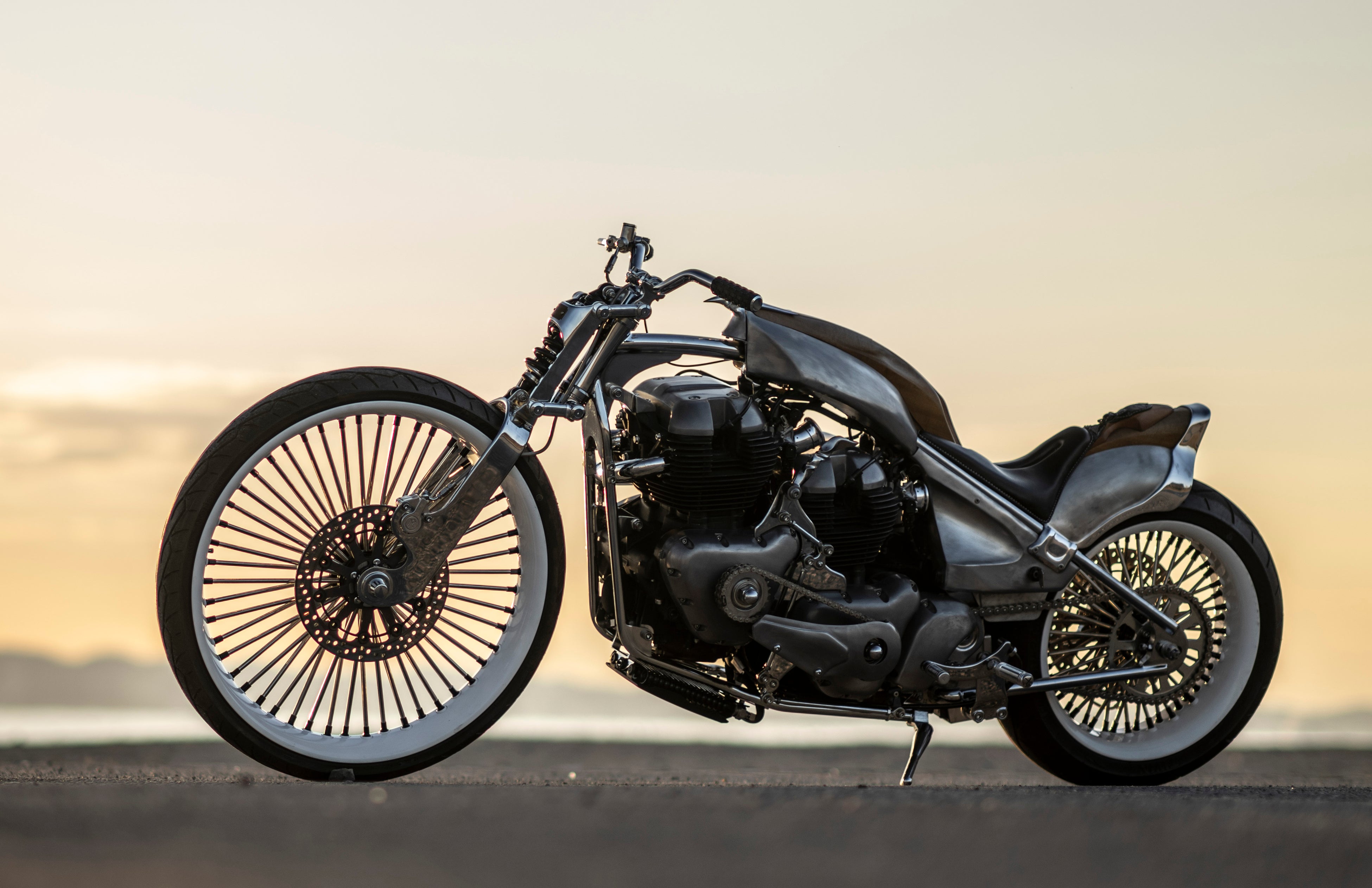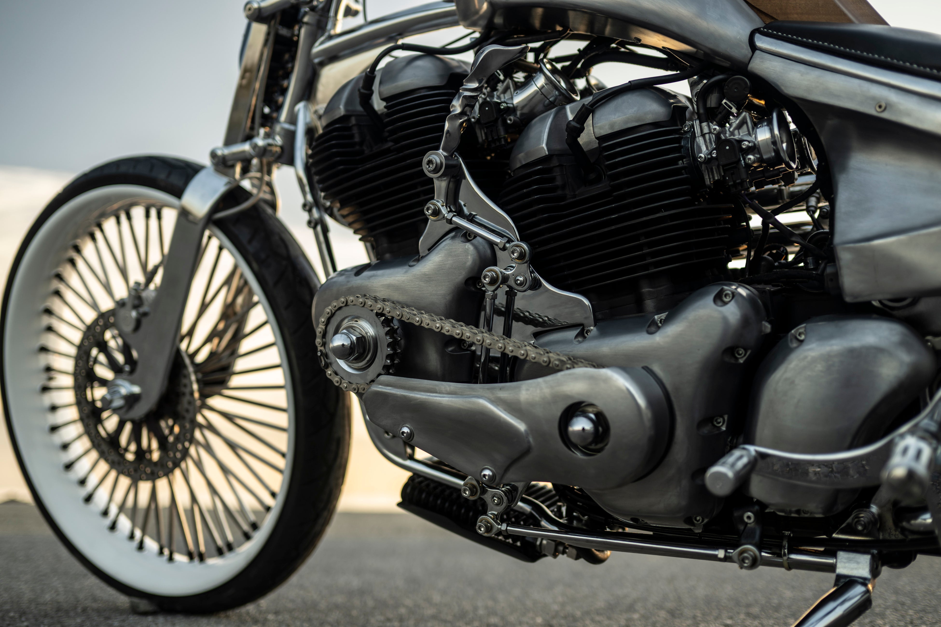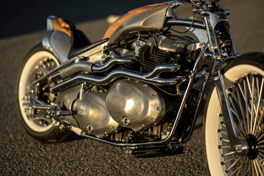 最大の特徴は、ロイヤルエンフィールドの新型車「クラシック 650」の排気量648cc空冷4ストローク並列2気筒SOHC4バルブエンジンを2基搭載していること。前側エンジンのミッションを取り外し、クランクケースを短く加工。前後2つのエンジンを、エンジン左側に配置したプライマリーチェーンによって連結しています。