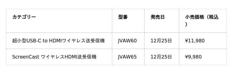 「JVAW60」 は、USB-C端子を搭載したスマートフォン、タブレット、ノートPCの映像を、HDMI対応ディスプレイへ ワイヤレスで簡単にミラーリングできる送受信機セット です。