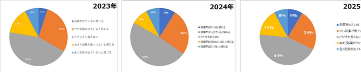 2023年の調査では、67%の組織が効果を感じられていないという実態が明らかになりました。2024年においてもその数字は65%とほとんど変化が見られず、2025年には再び67%となり、改善の兆しは見られませんでした。3年間の調査を通じて、「効果を感じられないまま続けている」ことが大きな課題として浮き彫りになりました。効果が感じられないのであれば、PDCAを回すなどして改善を図るべきですが、実態として効果を感じられないまま施策を続けてしまっている可能性があります。これは、人材育成の効果について「問題不感症」になってしまっていることが懸念されます。