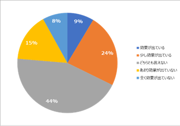 「現在の人財育成施策の効果について教えてください」という質問に対し、『効果が出ていると感じる』9%、『効果が少し出ていると感じる』24%、『どちらとも言えない』44%、『効果があまり出ていないと感じる』15%、『効果が出ていないと感じる』8%という結果になりました。 どちらとも言えない・効果があまり出ていないと感じる・効果が出ていないという回答を合算すると67%の組織で効果を感じられていないという結果となりました。人財育成施策について見直す必要が出てきている課題が明らかになりました。