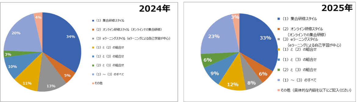 コロナ禍でオンライン研修が普及しましたが、ポスト・コロナとなり、集合研修が回復基調にあり、集合研修スタイルが33%で1番多い回答となりました。2023年度から2024年度にかけて集合研修が増加傾向にあり、2024年度から2025年度にかけてはほぼ横ばいでした。感染症も落ち着き、集合研修で人材育成を実施することが、またスタンダードに戻ってきていることなどが推察されます。