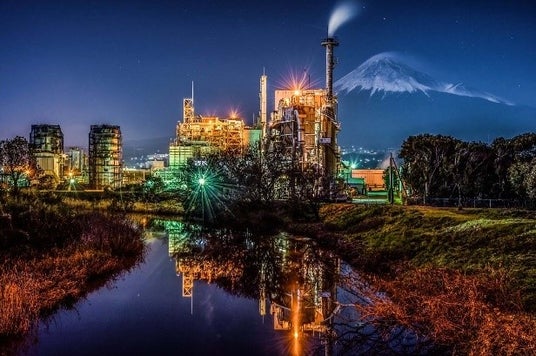 日本製紙(株)富士工場(吉永)工場の南側の新滝川橋からは、滝川の川面に映る逆さ富士と逆さ工場夜景が撮影できます。工場では、身近な段ボールやお菓子箱の原紙を生産しています。