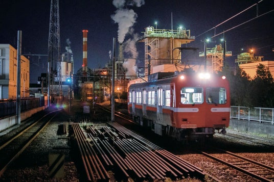 岳南原田駅岳南原田駅からは、線路が工場・煙突に吸い込まれるようなアングルが楽しめます。工場夜景と電車を一緒に見ることができるスポットとして人気。原田駅から比奈駅方面に向かう電車内から眺める工場夜景も見どころです。