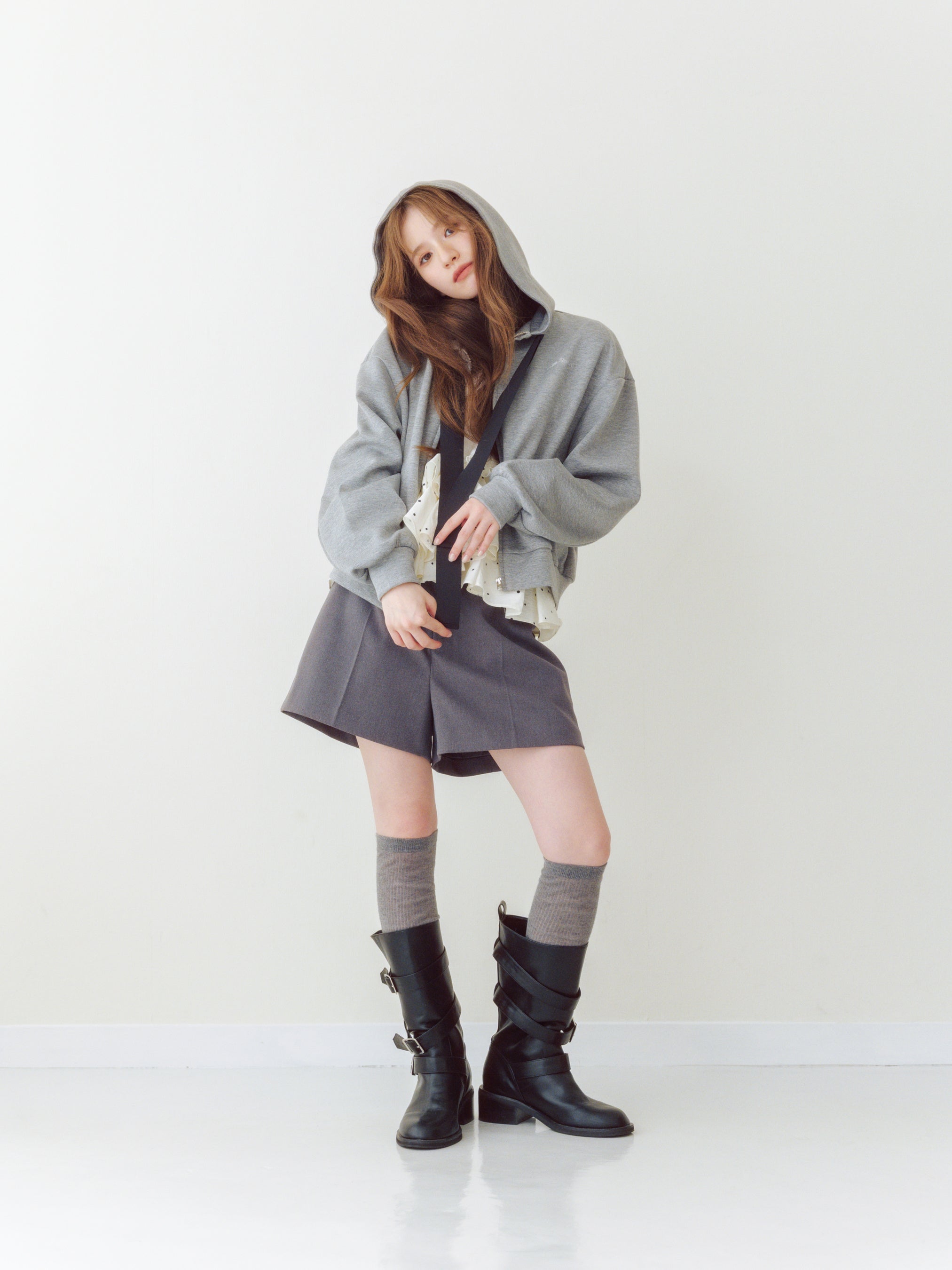 フーディーは、丸みのあるコンパクト丈でカジュアル過ぎず女性らしいバランスに。