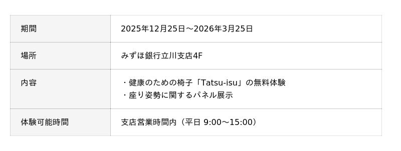 本コーナーでは、当社が開発した人間工学に基づく健康家具「Tatsu-isu(タツイス)」を無料で体験いただけます。高齢化社会において、椅子の選び方が健康やQOL(生活の質)に大きな影響を与えることが注目されており、「立ち座りのしやすさ」「姿勢の快適性」「フレイル(虚弱)予防」など、椅子と姿勢の重要性を広く啓発する目的で設置いたしました。