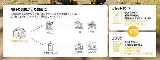 1、ガソリン/カセットガスのデュアル燃料対応GS950iD-B は燃料切替スイッチの操作により、使用シーンや燃料の入手状況に応じて燃料を切り替えられ、安心かつ柔軟な運用が可能です。