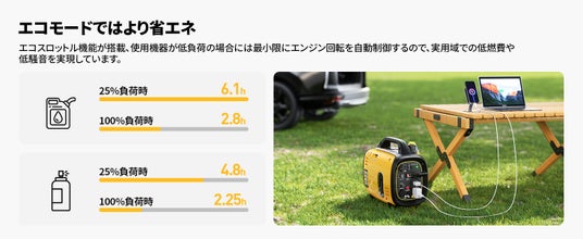 連続運転時間(100%負荷):約2.8時間(ガソリン)、約45min(カセットボンベ)