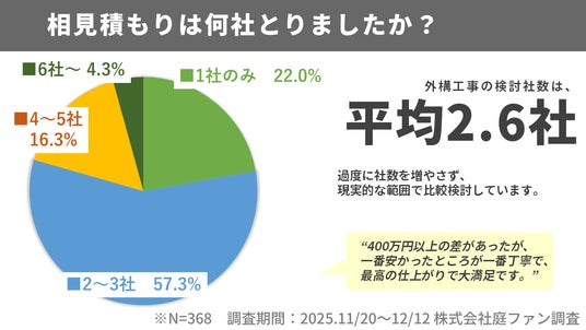 外構の相見積もり社数について調査したところ(n=368)、「2~3社」が57.3%と最も多く、平均すると約2.6社を比較していることが分かりました。