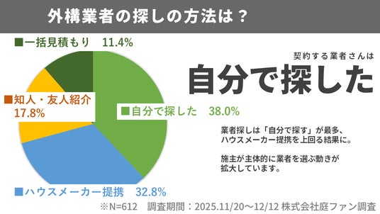 外構業者の探し方については、「自分で探した外部業者」が38.0%と最も多く、「ハウスメーカー提携(32.8%)」を上回る結果となりました。