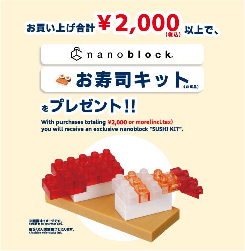 POP UP STORE開催を記念して、税込2,000円以上お買い上げのお客様に「nanoblock(R) お寿司キット」をプレゼントします。