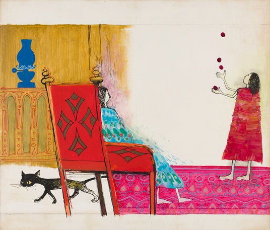 2.正田壤(1928-2016)太田市立新田図書館蔵、『まっかっかなむすめがまどからのぞいている』絵本原画 1973年、油彩、カンヴァス 53.0×45.5cm