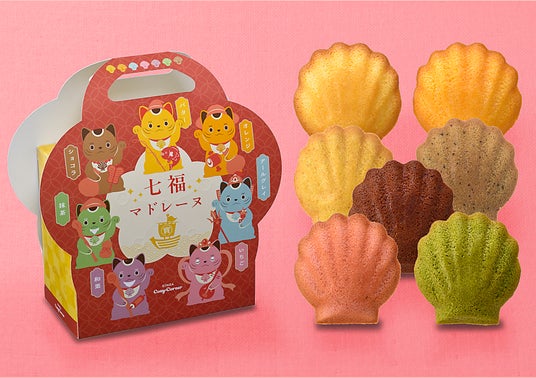 運だめしができて願いごとも書ける「おみくじ付き絵馬クッキー(10個入)」はクッキー2種を、”七福神に扮した招き猫“デザインの「七福マドレーヌバッグ(7個入)」は人気のマドレーヌ7種を、スイーツ柄ブランケットが付いた「新春福袋(28個入、グッズ付き)」はクッキー4種とマドレーヌ5種をアソートしました。