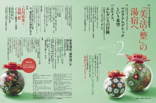 株式会社世界文化社は、『家庭画報 2月号』を12月27日(土)に発売します。巻頭特集「『美・活・整』の湯宿へ」では、進化する日本各地のウェルネス温泉宿をご紹介。「マルタ・アルゲリッチという希望」では、ピアニスト マルタ・アルゲリッチさんの特別インタビューと広島でのコンサートの様子をお届けします。さらに、松嶋菜々子さんが着こなす「エルメス 2026年春夏新作コレクション」、特別対談「バレーボール絶対エース 石川祐希×高橋 藍」、密着取材「箱根駅伝2026」、2026年を占う「あなたのための開運法」など、活気をもたらす豪華な企画満載です。