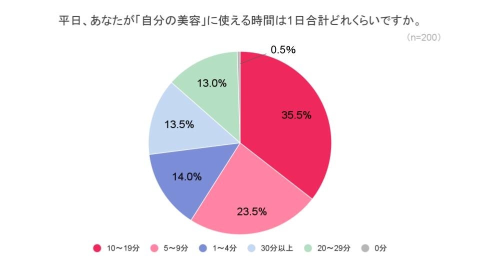 平日に「自分の美容」に使える時間について、最も多かった回答は「10~19分」で35.5%でした。「5~9分」が23.5%、「1~4分」が14%と続き、10分未満の方は合計37.5%に上ります。