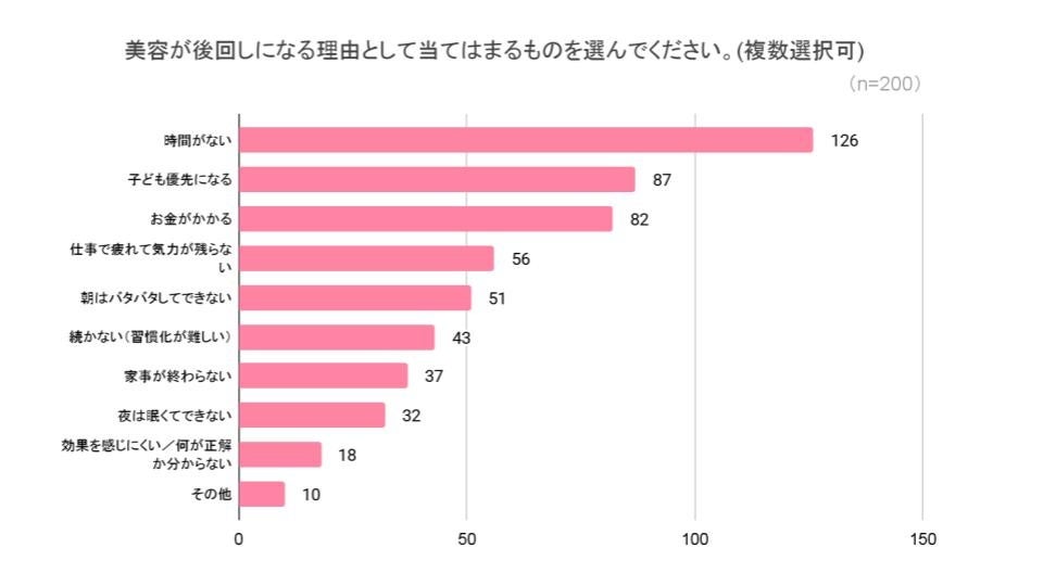 美容が後回しになる理由を複数回答で尋ねたところ、「時間がない」が126件(63%)で圧倒的多数を占め、次いで「子ども優先になる」が87件(43.5%)、「お金がかかる」が82件(41%)、「仕事で疲れて気力が残らない」が56件(28%)と続きました。