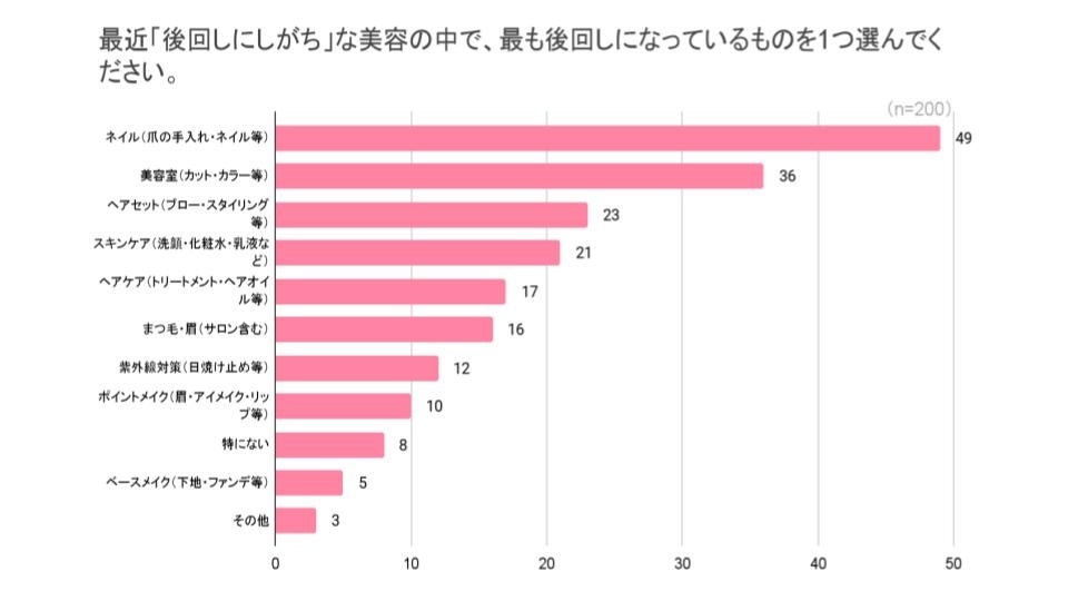 さらに「最も後回しになっているもの」を1つ選んでもらったところ、「ネイル」が49人(24.5%)で最多、「美容室」が36人(18%)、「ヘアセット(ブロー・スタイリング等)」が23人(11.5%)、「スキンケア」が21人(10.5%)となり、特に手先や髪の美容が犠牲になりやすい実態が明らかになりました。
