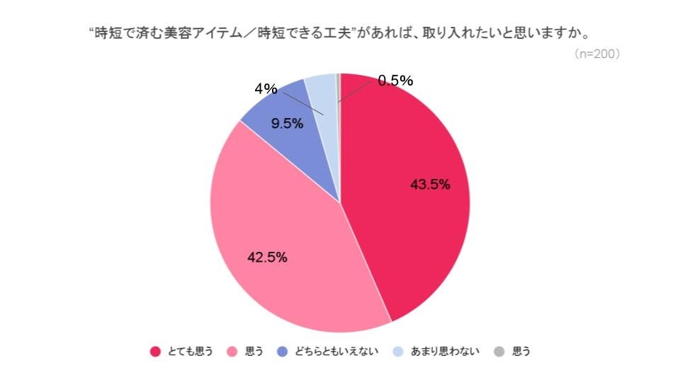 「時短で済む美容アイテム/時短できる工夫」があれば取り入れたいかを尋ねたところ、「とても思う」が43.5%、「思う」が42.5%と、約8割が前向きな回答をしました。「どちらともいえない」が9.5%、「あまり思わない」が4%、「まったく思わない」はわずか0.5%にとどまり、時短美容への強いニーズが明らかになりました。