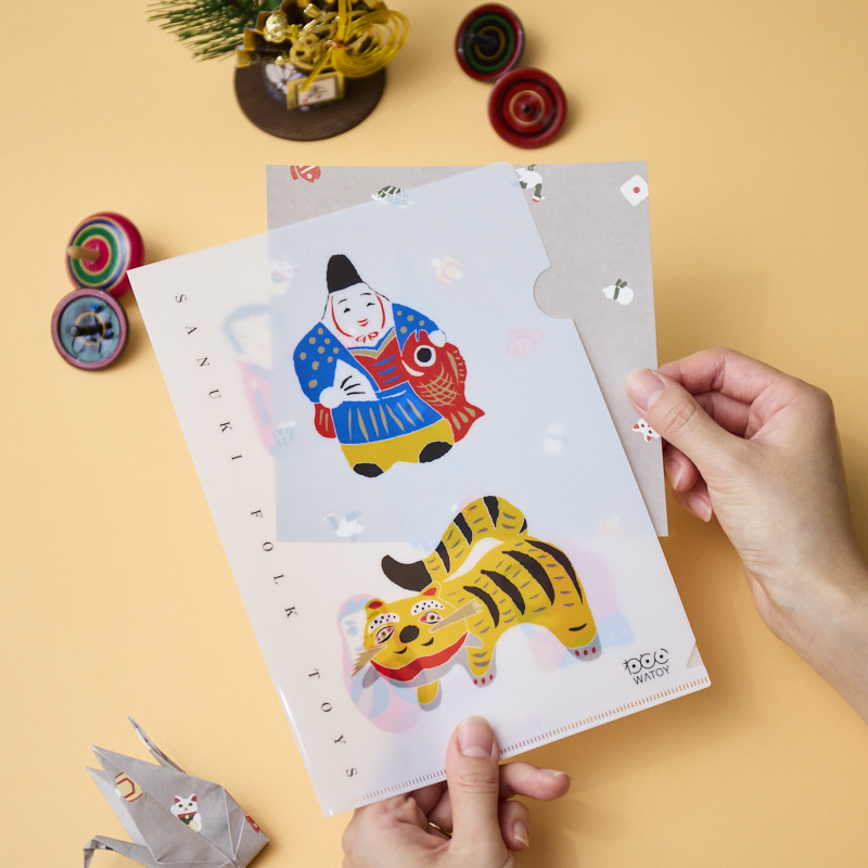 讃岐の郷土玩具をモチーフにした文房具を展開する「WATOY(ワトイ)」の、表と裏で柄が異なるA5サイズのクリアファイルです。