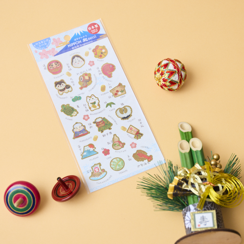 達磨やお多福、獅子舞などの縁起物を金箔で飾った和紙シールです。手帳やポストカードに貼っておめでたい雰囲気を味わえるだけでなく、それぞれの名前が漢字と英語で表記されているため、漢字やモチーフの理解につながります。モチーフの意味を調べながら、文化背景ごと楽しめる点も魅力です。