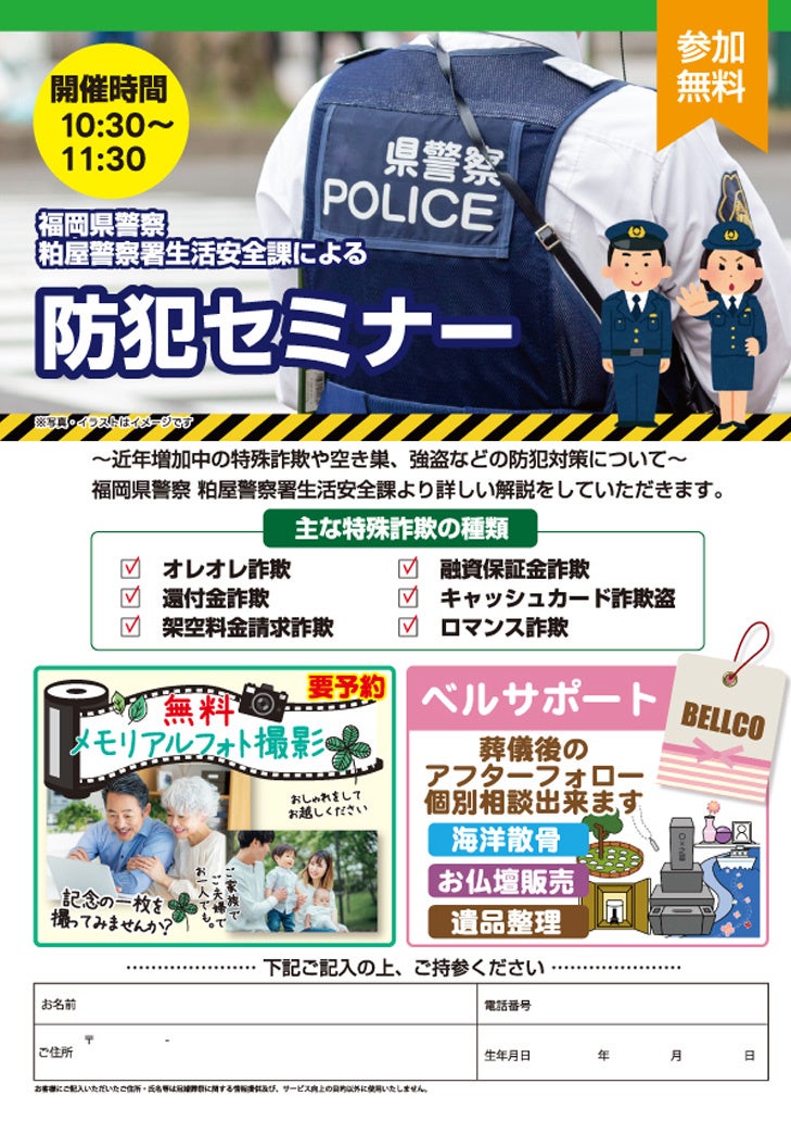 冠婚葬祭サービスを通じて地域に寄り添う株式会社ベルコは、地域住民の皆さまの安心・安全な暮らしを支援する取り組みとして、福岡県警察 粕屋警察署生活安全課による防犯セミナーを開催いたします。