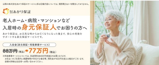 「かんでん暮らしモール」は、「どこに頼めばよいかわからない暮らしのお困りごとを解決する!」をコンセプトとしており、引越しや収納をはじめとする生活サポート分野や、かんでん保険や住宅ローン等の保険・金融分野においてサービスの拡充を行ってまいりました。この度、「介護施設や病院入所時の保証人がいない」「亡くなった後の手続きを家族に負担させたくない」といった終身にまつわるお困りごとを解決すべく、サービス提供会社である株式会社あかり保証が、身元保証人・連帯保証人となるサービス、およびお亡くなりになられた後のご葬儀・ご遺体の引取り等の死後事務手続きを行うサービスの提供を開始いたしました。