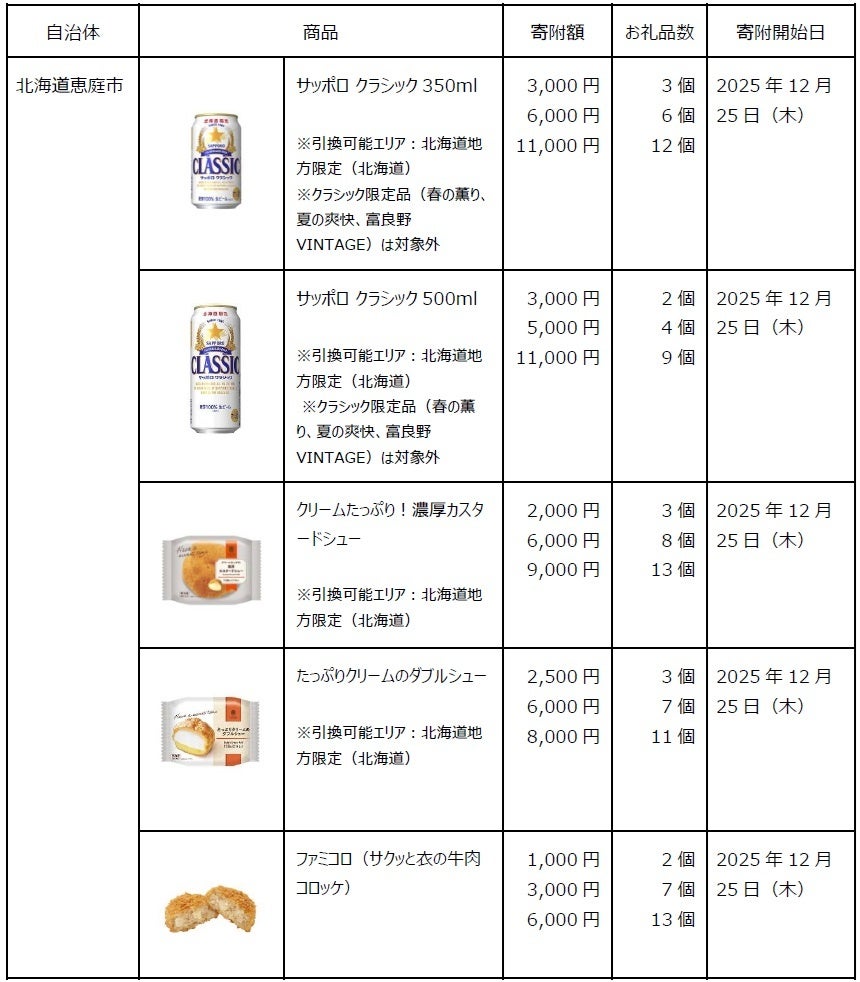 年末にかけてふるさと納税の需要が高まっている中、このたび、北海道恵庭市で製造されているおかずにもぴったりの「ファミコロ(サクッと衣の牛肉コロッケ)」や、北海道限定で引換いただける「たっぷりクリームのダブルシュー」、「サッポロ クラシック350m/500ml」など、5商品を追加いたします。