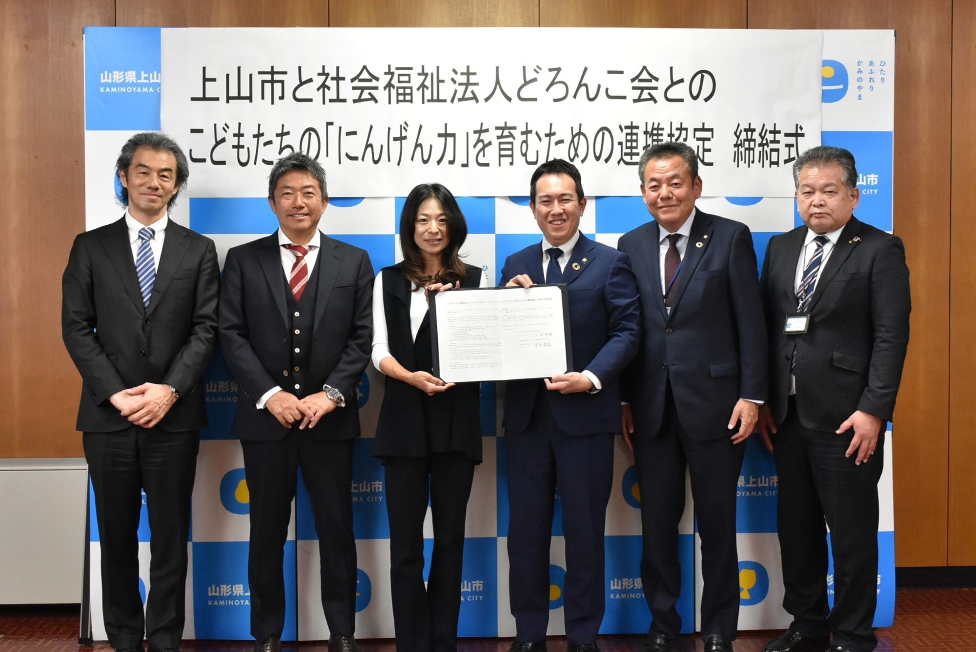 【出席者】上山市 山本幸靖 市長、上山市 鈴木英夫 副市長、社会福祉法人どろんこ会 安永愛香 理事長、株式会社ゴーエスト 高堀雄一郎 代表取締役(どろんこ会グループ) ほか