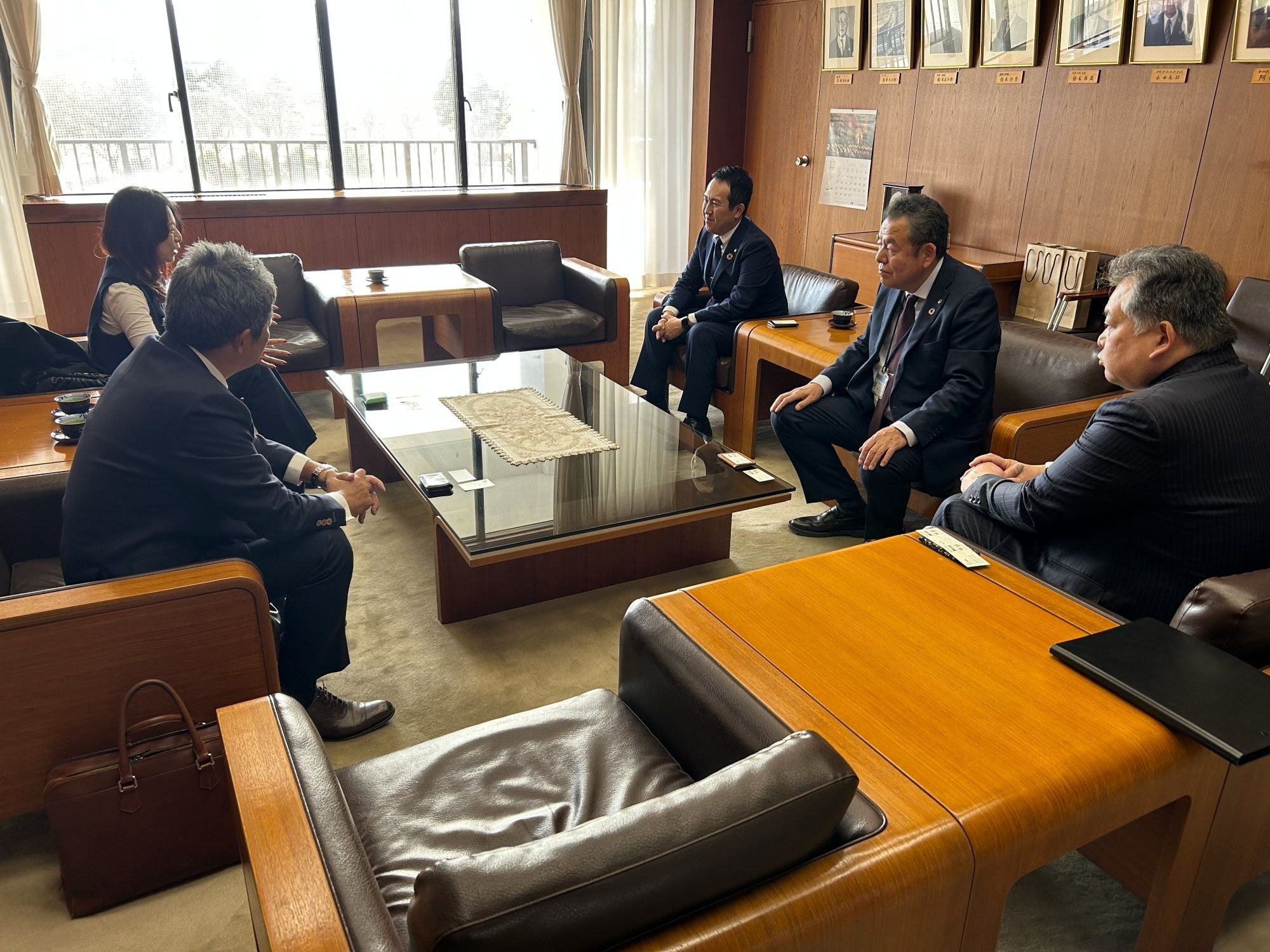 上山市役所で歓談する安永理事長(左奥)と山本市長(右奥)
