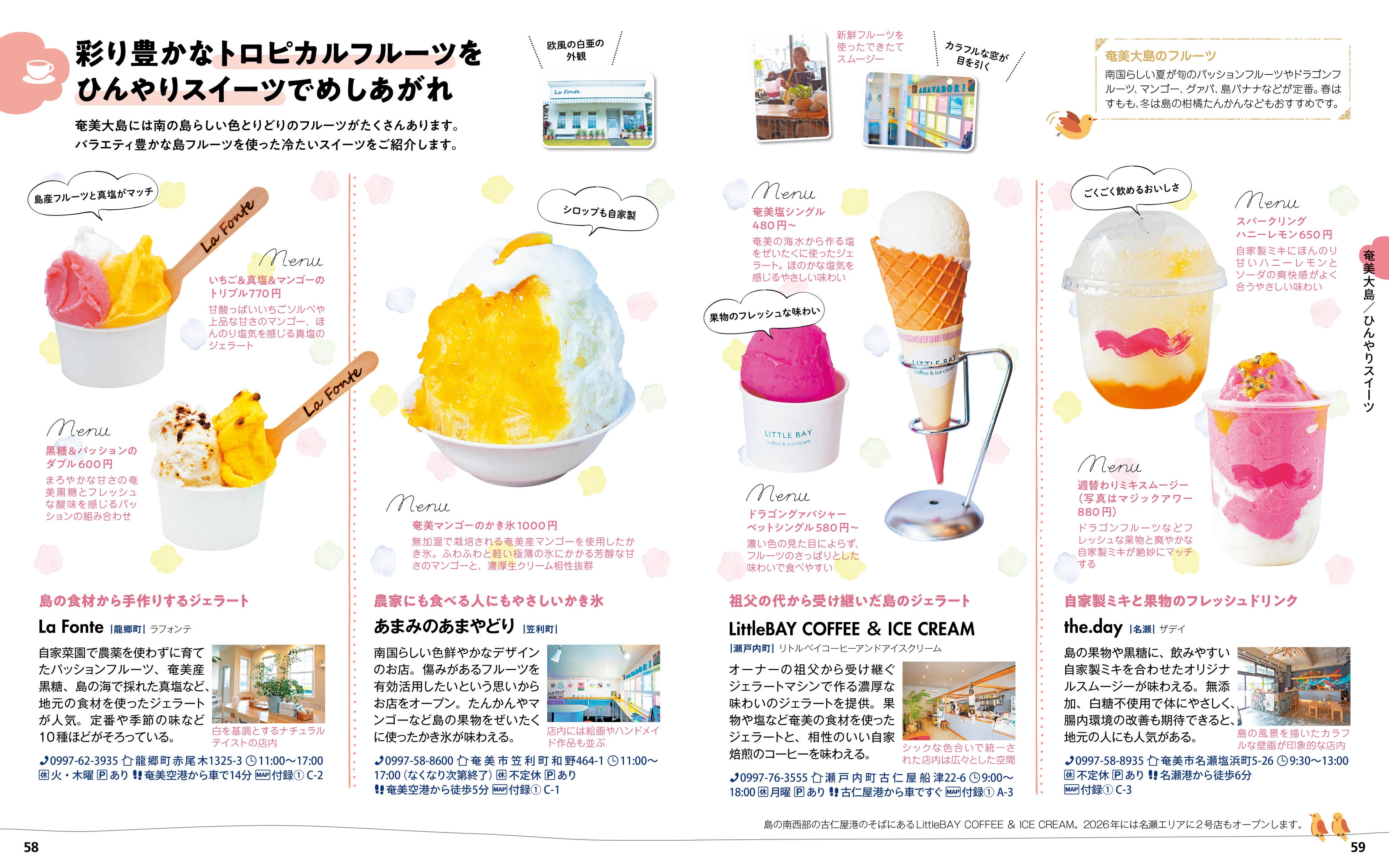 南国らしいトロピカルフルーツを使ったひんやりスイーツや、奄美群島でのみ製造が認められている黒糖焼酎など、お腹も心も満たされるラインアップです。