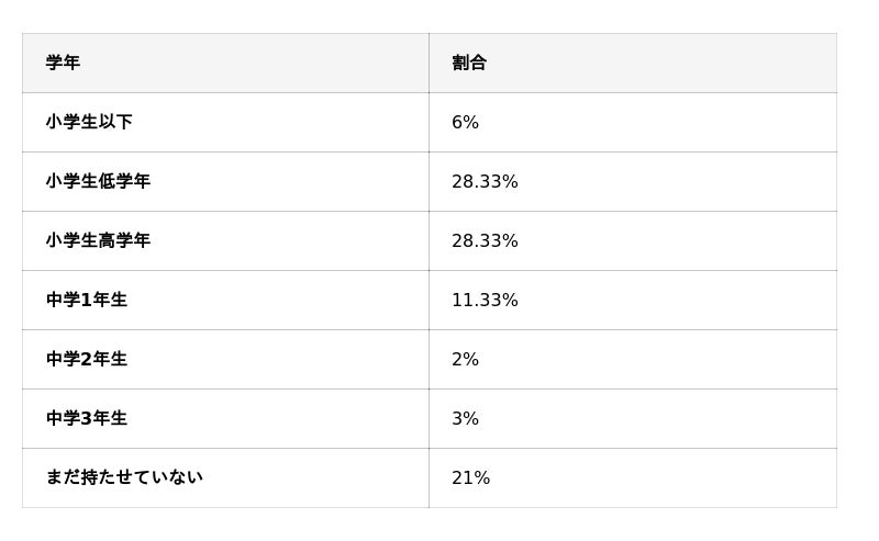 中学1年生は11%、中学2~3年生は合わせて5%と、中学生以降にスマホを持ち始めるケースは少数派です。