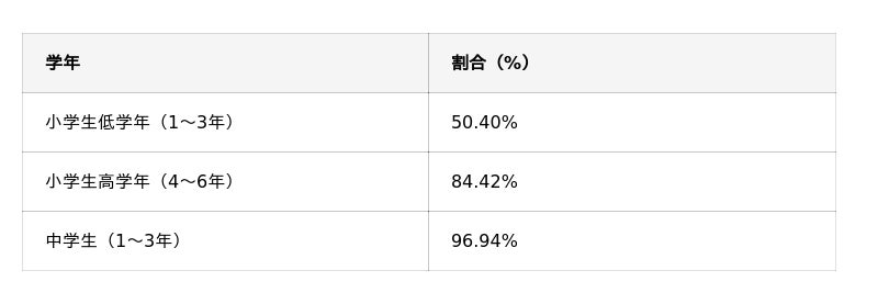 中学生の所有率は96.9%で、小学生低学年(50%)の約1.9倍でした。低学年から高学年の間に34ポイント上昇しています。