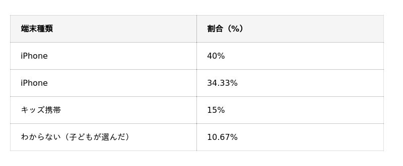 iPhoneとAndroidを合わせると73%となり、キッズ携帯(15%)の約4.9倍でした。子どもにはキッズ携帯よりも通常のスマートフォンを持たせる家庭が圧倒的に多いことがわかります。