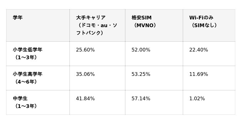 格安SIMが全学年で50%超(小学低学年52%→高学年53%→中学生57%)で、大手キャリア(25%→35%→41%)を上回りました。