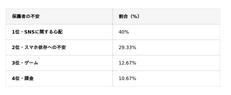 SNSトラブル(40%)が最多でした。スマホ依存(29%)やゲーム(12%)より、SNSを通じた人間関係のトラブルを心配する保護者が多い結果となりました。