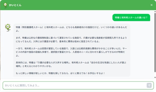 それに次ぐ今回のアップデートでは、その取り組みをさらに発展させ、AIによる対話型検索を中心に据えた情報探索体験へと再設計しました。AIエージェントもキャラクター「かいとくん」として開発し、親しみやすいUIの裏側に、介護情報を正確に理解・整理するための技術基盤を組み込んでいます。