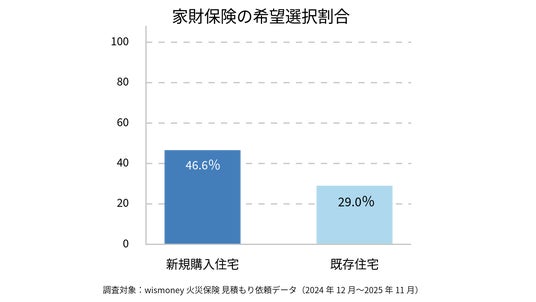 Mt.flowers株式会社(本社:東京都江東区)が運営する火災保険一括見積りサービス「wismoney(ウィズマネ)」は、2024年12月から2025年11月に寄せられた見積り依頼データをもとに、新規購入住宅と既存住宅における火災保険の選び方の違いを分析しました。