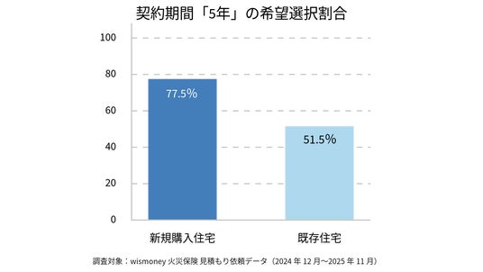 契約期間を見ると、新規購入住宅では5年契約を選択する割合が77.5%と高く、既存住宅(51.5%)との差が確認されました。