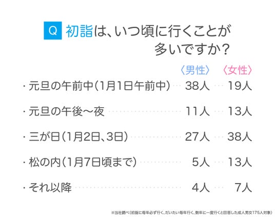 次いで「元旦の午前中」「元旦の午後~夜」と続き、全体の8割以上が1月3日までに初詣を済ませていることがわかります。