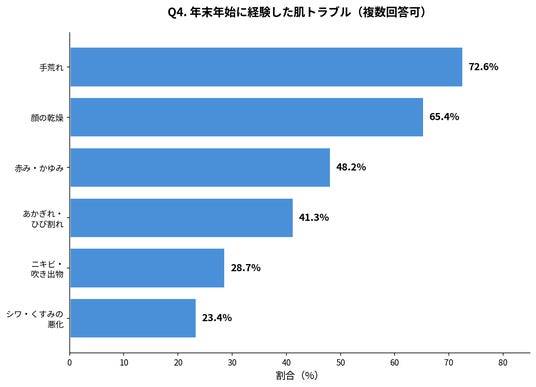 最も多かったのは「手荒れ」(72.6%)で、次いで「顔の乾燥」(65.4%)、「赤み・かゆみ」(48.2%)という結果になりました。