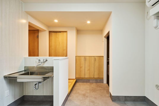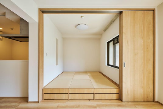・子育て・SDGsを意識したリノベーション専有部は、子育てを快適にする広々とした玄関土間や、くつろぎと遊び場を兼ね備えた小上がりスペースなど、子育て世帯に優しいプランニングを行っています。アップサイクル建材を天井や壁に使用し、リノベーション工事で出た畳やカーテンの廃材をアップサイクルしたおもちゃをキッズコーナーに用意。SDGsを身近に感じられる仕掛けを作りました。